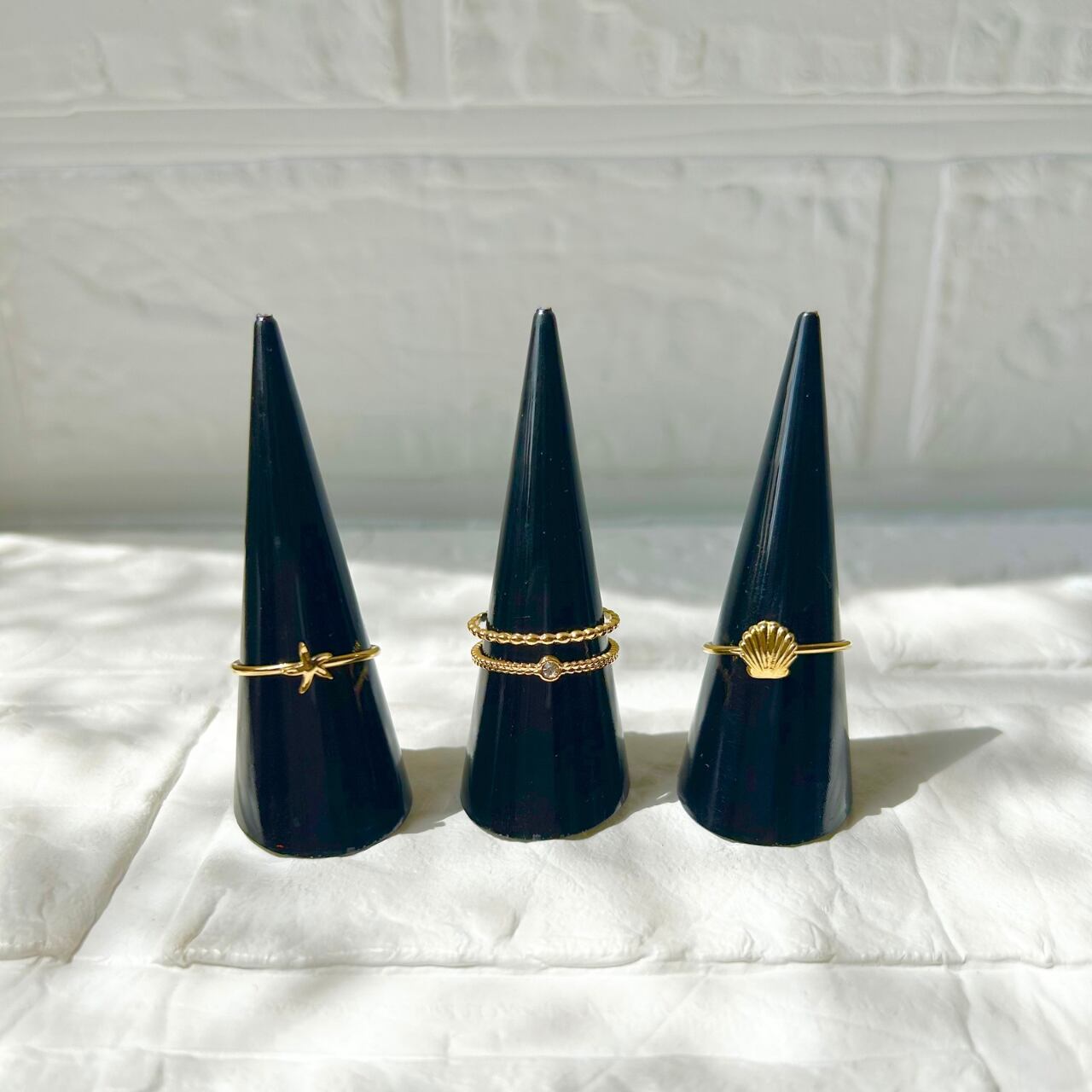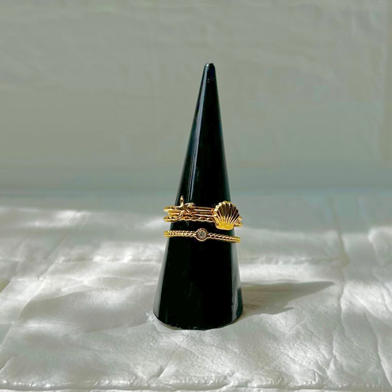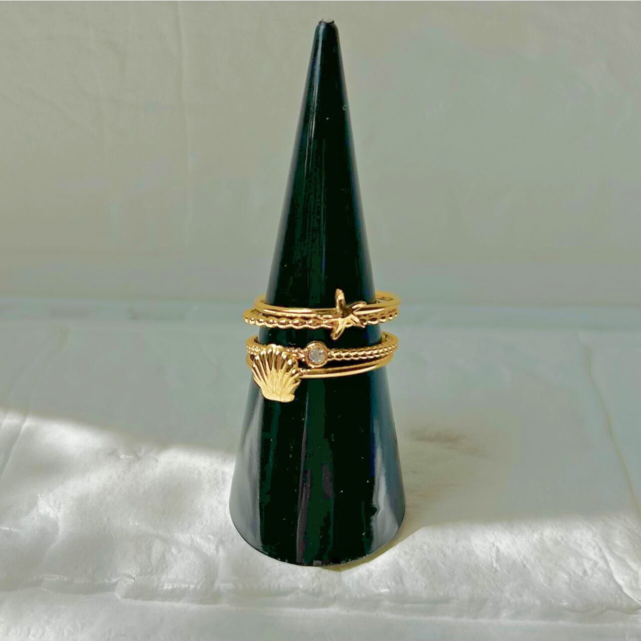 シェル、ヒトデ、小さなジルコニアのついた繊細な2連リングの3つがセットになったレイヤーリング。