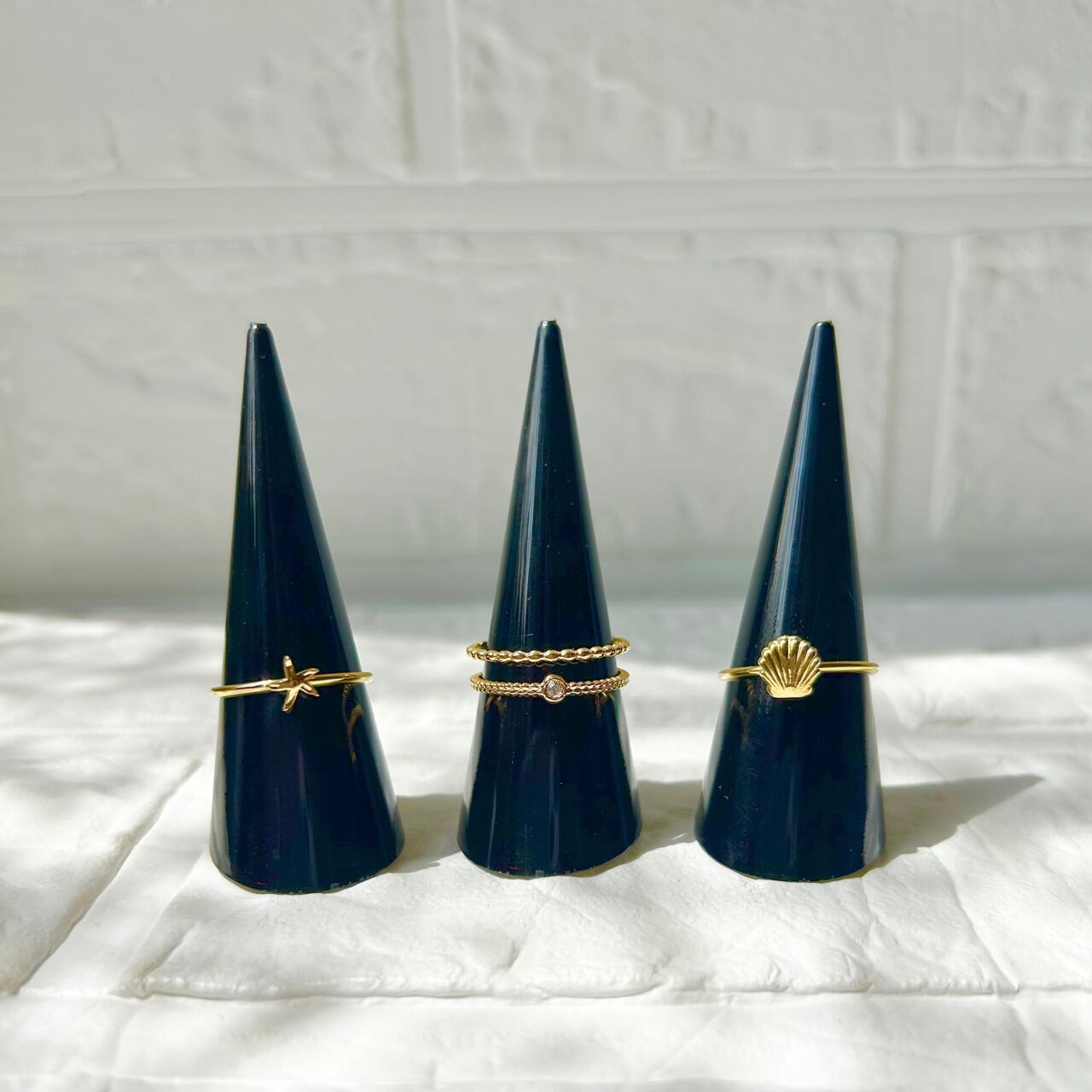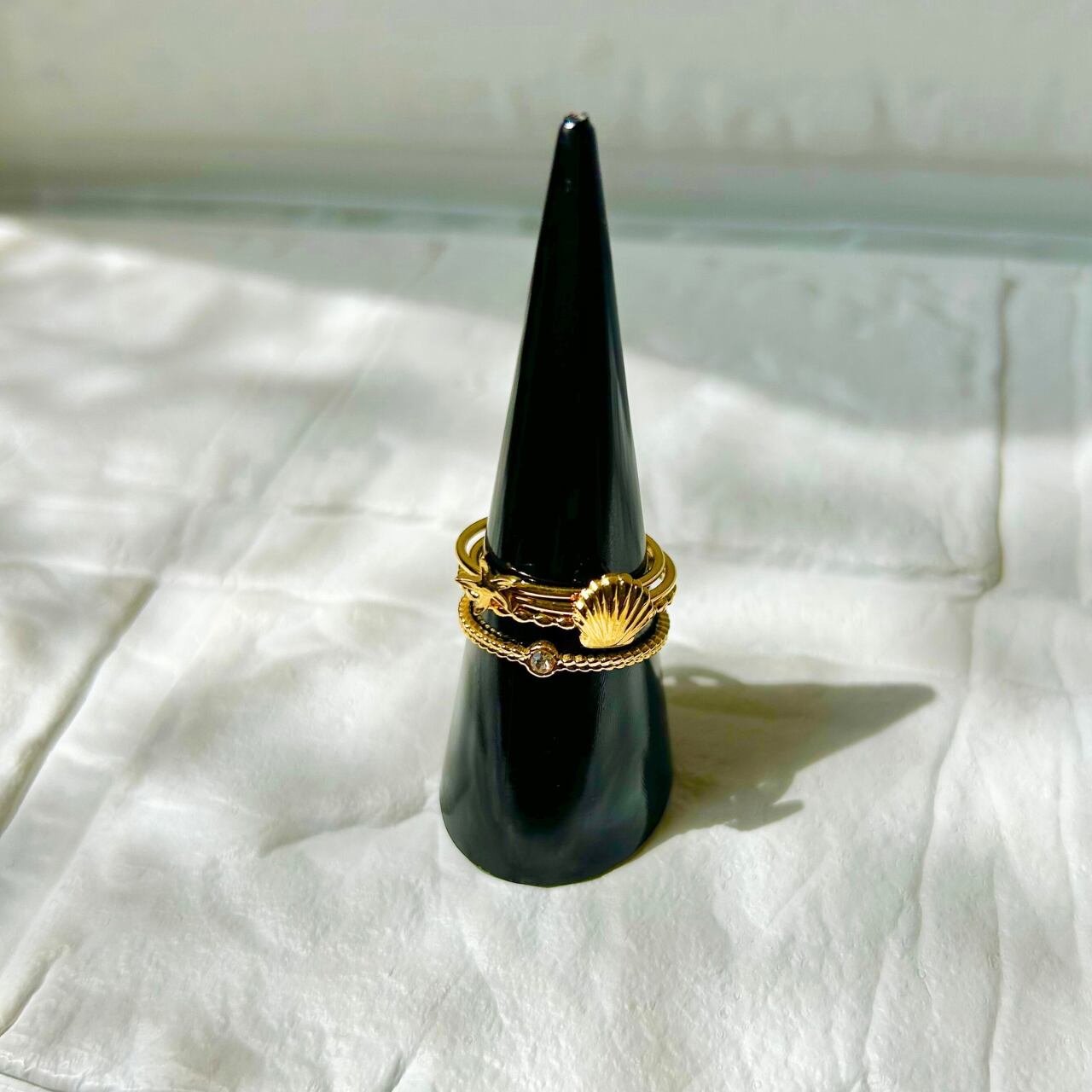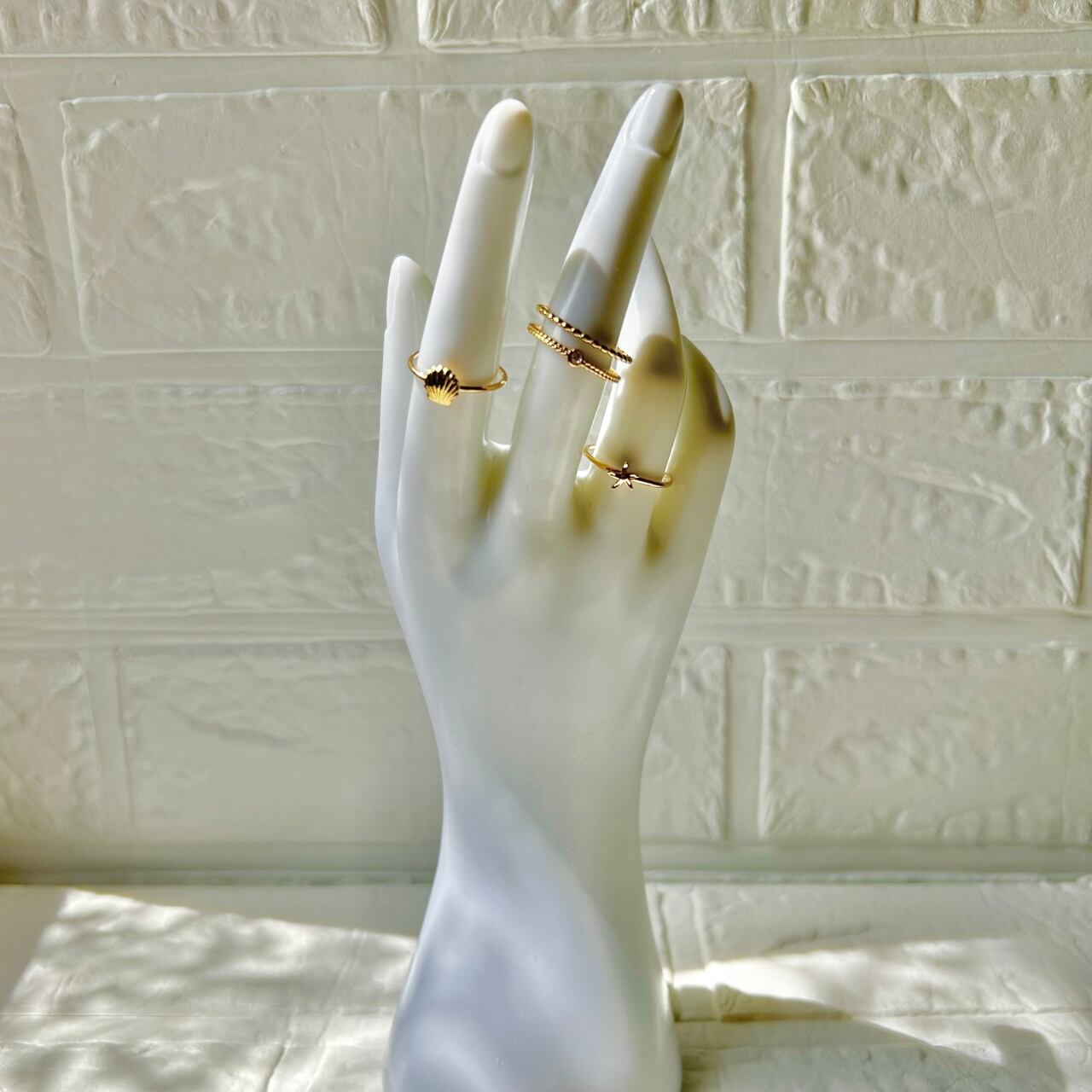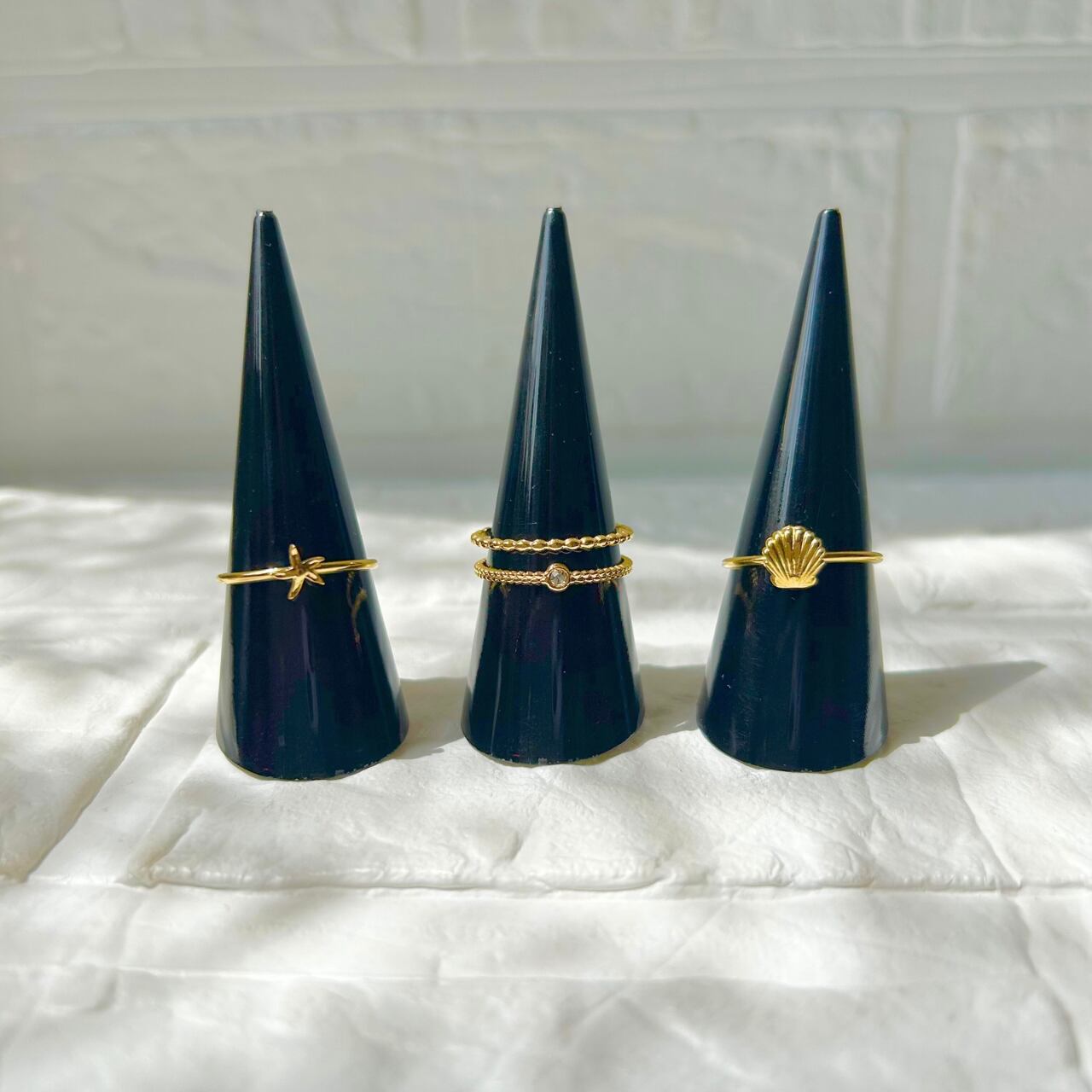 シェル、ヒトデ、小さなジルコニアのついた繊細な2連リングの3つがセットになったレイヤーリング。