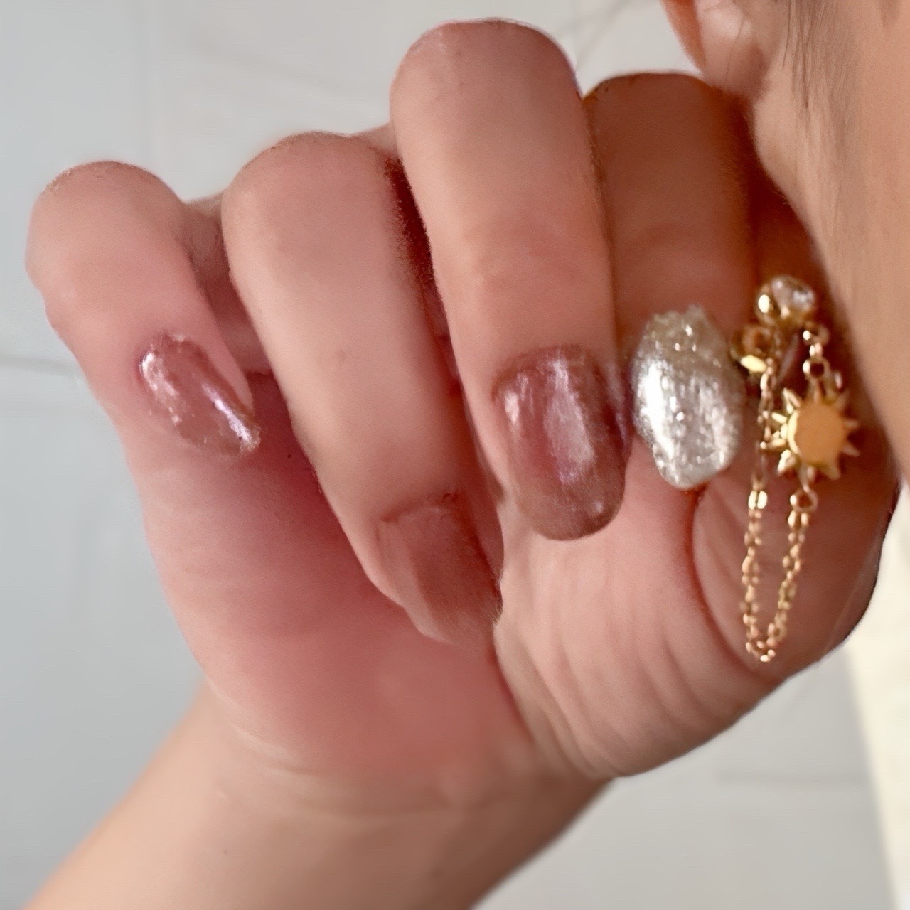 ゴールドのチェーンがゆらゆらと揺れ、耳元に夏の空を描くようなアシンメトリーデザインのピアス。