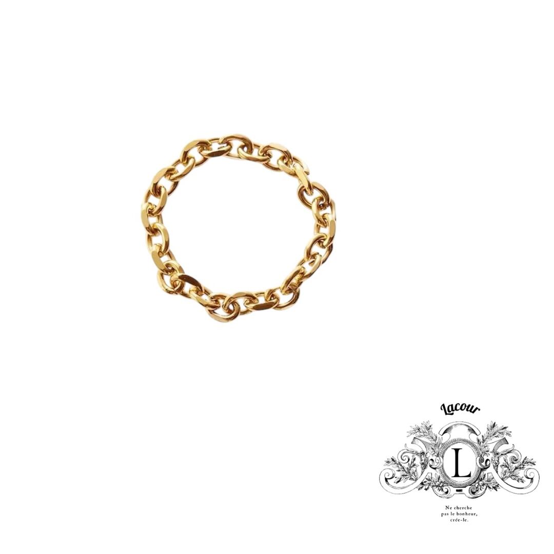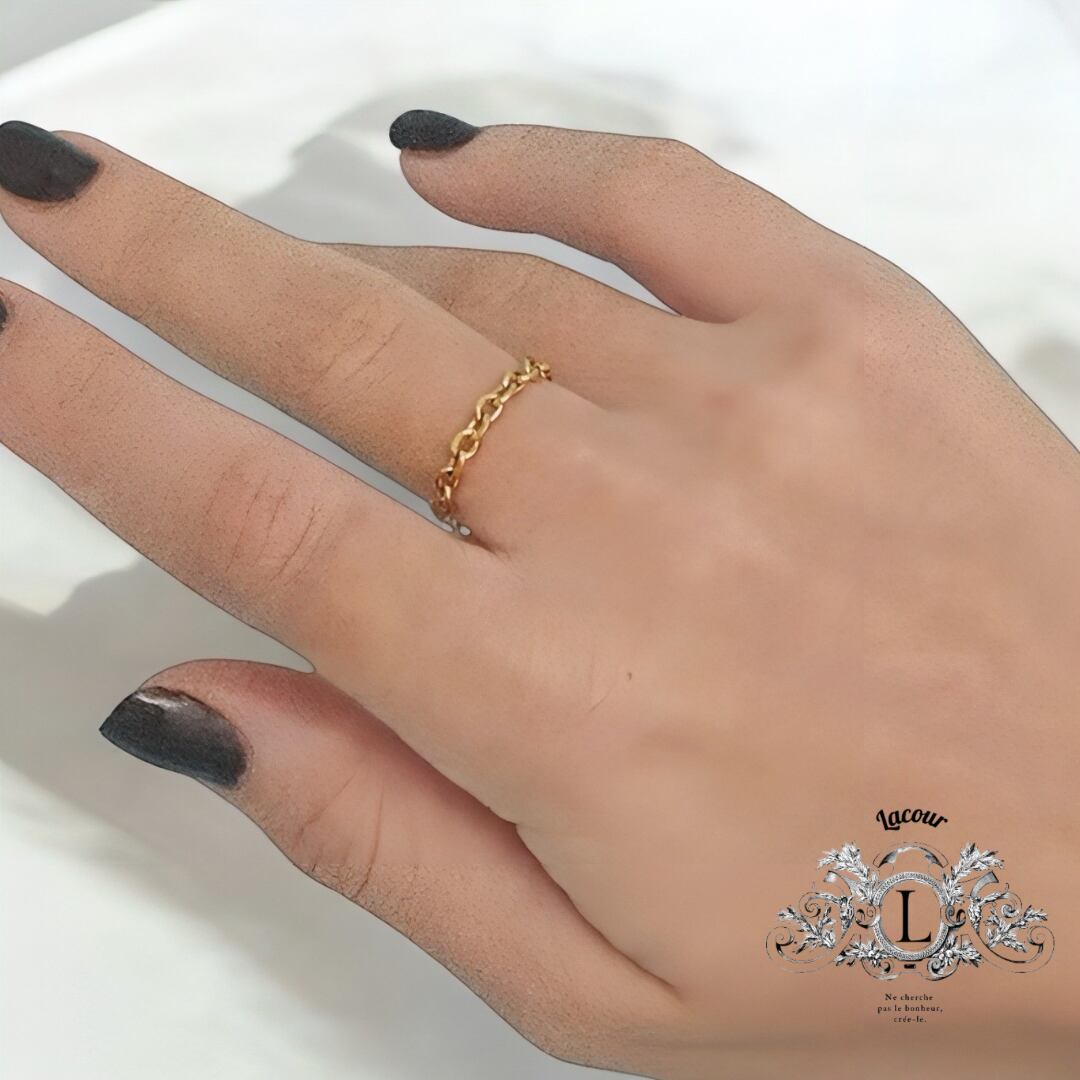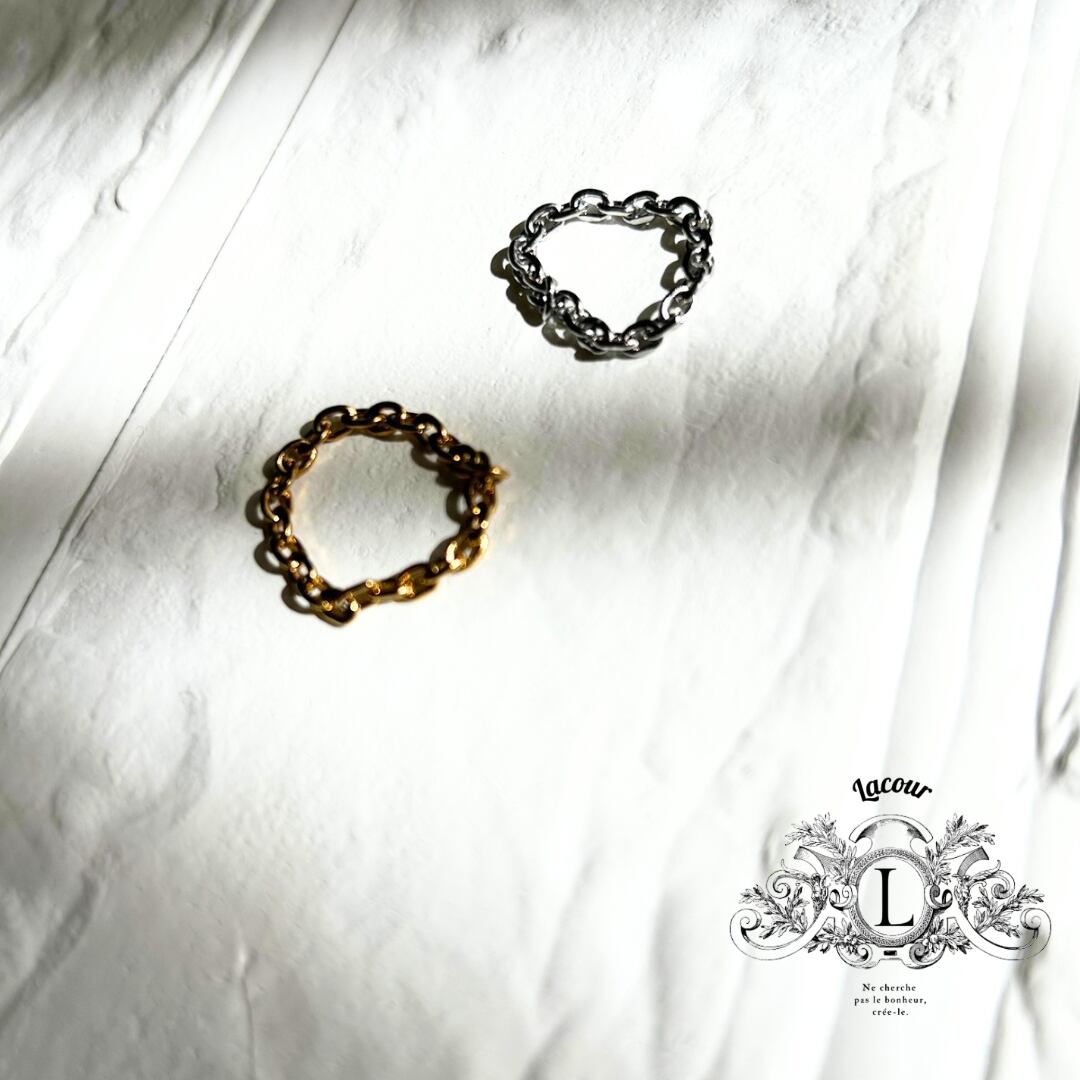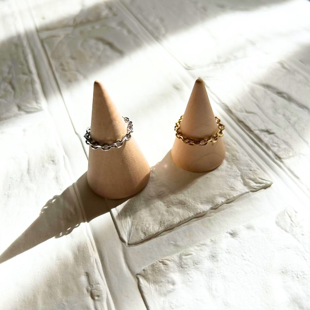 こちらは、デザインが魅力のチェーンリングです。洗練された輪郭が、指先を華やかに演出してくれるアイテムで普段お使いのリングにプラス、重ね付けもオススメです。